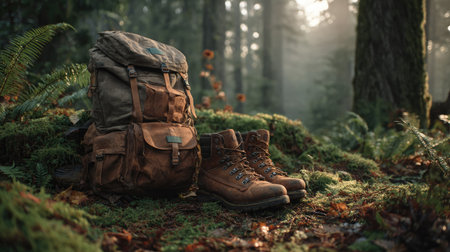 A rustic backpack rests beside a sturdy pair of hiking boots on a mossy forest floor. Soft morning light filters through trees, creating a serene atmosphere ideal for adventure and exploration.