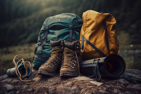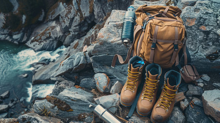 Hiking boots and gear ready for an outdoor adventure, set against a rocky terrain. AIG50