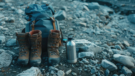 Hiking backpack, water bottle, and boots rest on a rocky terrain, inviting outdoor enthusiasts to embark on their next adventure in nature.
