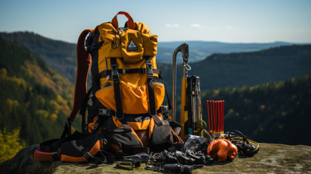 top view of a neatly arranged set of mountain climbing equipment, created with generative ai