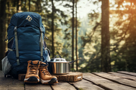 A hiking backpack and boots set on a wooden table in an outdoor setting, symbolizing adventure and exploration. The scene captures the essence of travel and readiness.