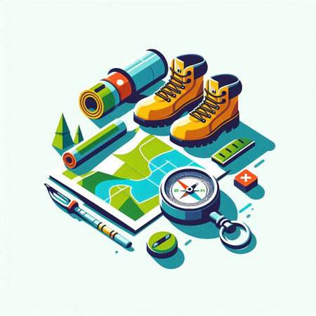 Tourism isometric concept with map, compass and boots vector illustration