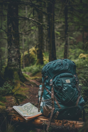 A backpack rests on the forest floor beside an open map and compass, inviting adventure in a tranquil natural environment filled with trees.