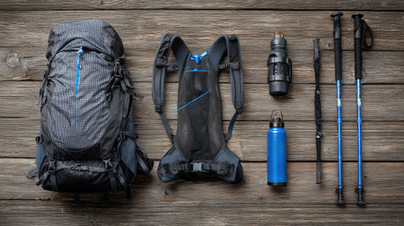 This image showcases a well-arranged collection of essential outdoor gear for hiking, including a backpack, trekking poles, a hydration pack, and a water bottle, perfect for adventure seekers.