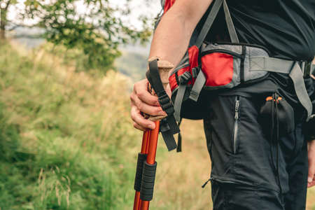 Man hand holding trekking sticks
