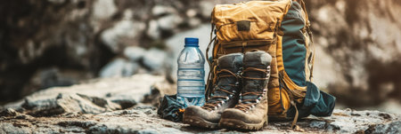 Hiking backpack, water bottle, and boots rest on a rocky terrain, inviting outdoor enthusiasts to embark on their next adventure in nature.