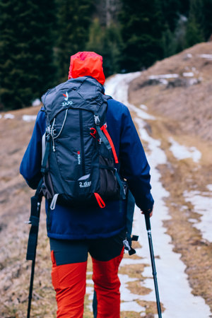 Piatra Neamt, Romania, 19th February 2022 - Man with equipment walking in the mountains during winter