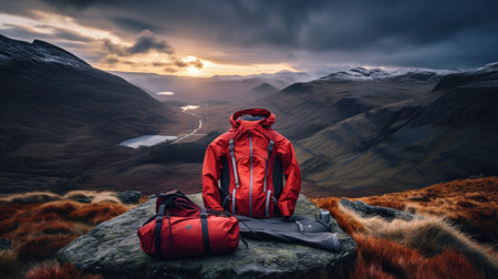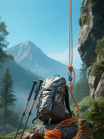 Hiking backpack, durable boots, and a water bottle are ready for an outdoor adventure in a breathtaking mountain landscape.