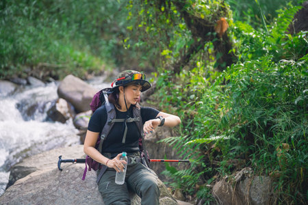 Adventurous Young Woman Checking Watch While Hiking Near a Stream Surrounded by Lush Greenery and Scenic Nature Landscape in Daylight
