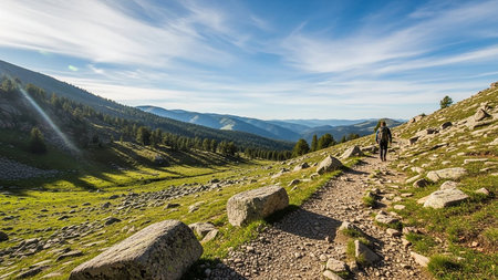 Individual enjoying a peaceful nature hike in the mountains, equipped with backpack and hiking gear, emphasizing physical activity and appreciation