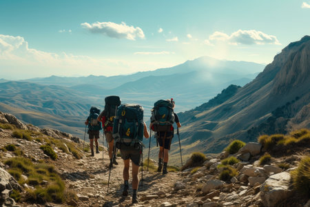 Group of people hiking on mountain footpath, enjoying nature beauty generated by artificial intelligence