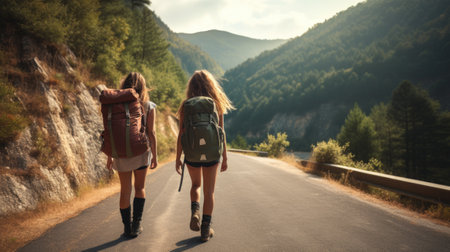 couple with backpacks are seen walking towards a majestic mountain view, with their backs turned towards the camera. The image evokes a sense of adventure, freedom, and exploration, as well as the bond between two people sharing a love for nature and the outdoors. Generative AI