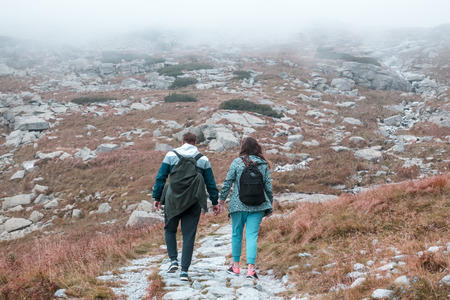 Two tourists in love boy and girl holding hands are walking among nature and mountains