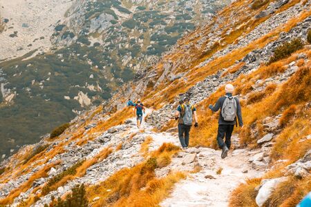 Group of tourists walking on mountain trail in autumn nature. Travel and adventure concept.
