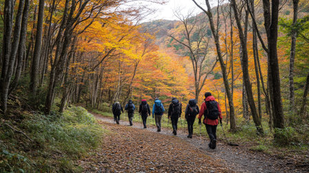 Group hiking trip through scenic forest landscape. Nature exploration, outdoor adventure, tranquil vacation.