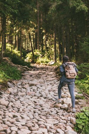 Hiking trail in the forest. Hiker hiking in the mountains.
