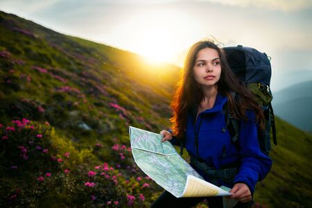 Shot of a young woman holding a map while taking in the view from the top of a mountain. Girl tourist in mountain read the map