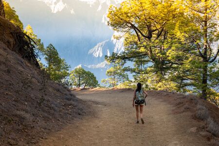 Young Active Woman Hiking Along Beautiful Green Forest Taburiente National Park