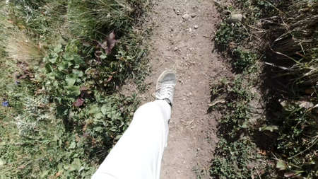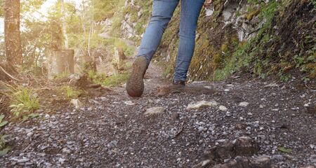 Walking or running legs on trail, adventure and exercising concept. Toned picture