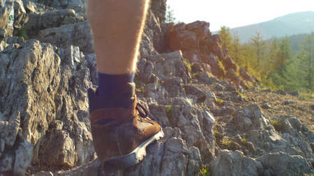 A close-up view of a hiker's boot traversing a rocky trail during the golden hour. This image captures the essence of outdoor adventures in nature's beauty.