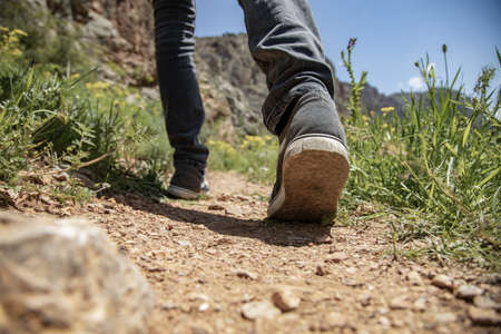 closeup of canvas shoes walking in soil path, adventure travel conception.