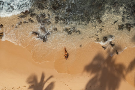 Top view of a woman sunbathing lying down on the tropical beach summer travel holidays drone shot