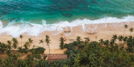 An aerial perspective captures a beautiful coastline with vibrant turquoise water meeting a sandy beach. Lush green palm trees line the shore, contrasting with the blue hues of the sea. This image showcases natural beauty, suitable for various commercial or editorial applications such as travel and tourism content.