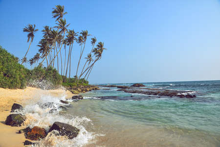 Tropical rocky beach with coconut palm trees, sandy beach and ocean. Tangalle, Southern Province, Sri Lanka, Asia.