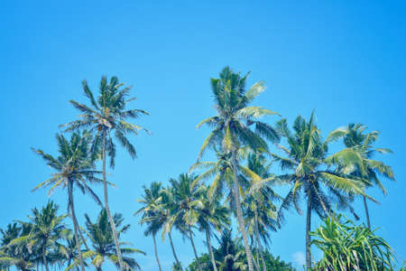 Beach, palm trees, sand, blue sky - a place for holidays and recreation. Soft focus background for lettering.