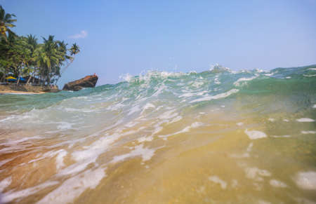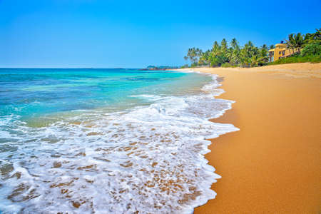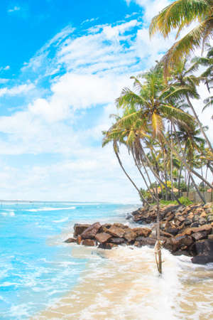 Beautiful sand beach with palm trees. Ocean waves at coastline in Sri Lanka.