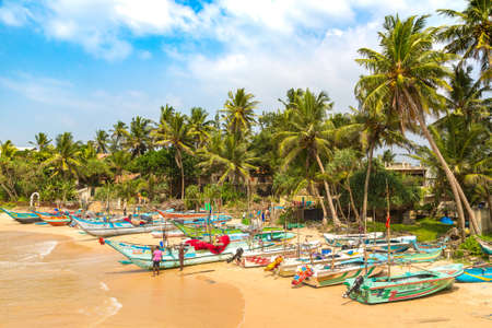 traditional fishing boat on a sandy beach in Hikkaduwa Sri Lanka