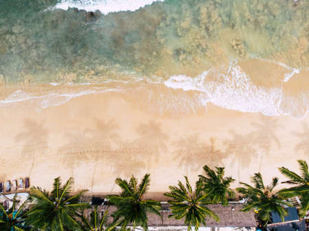Top view of beautiful white sand beach with turquoise sea water and palm trees, aerial drone shot
