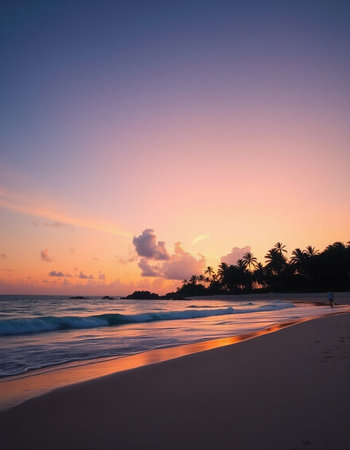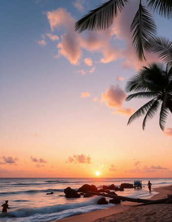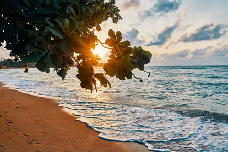 Ocean tropical beach sunset landscape with palm, Sri Lanka