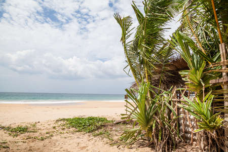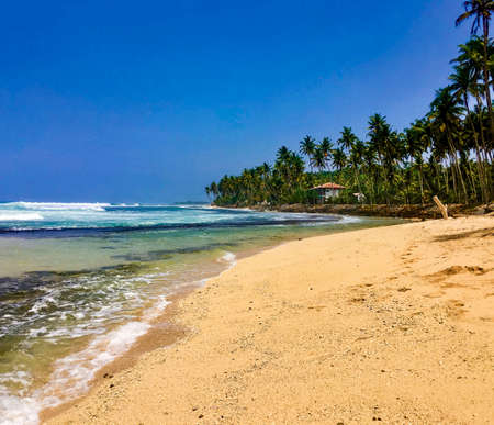 Beautiful hidden untouched tropical beach in Sri Lanka, blue sky, palms, ocaen and silence.