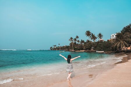 Blue haired girl in a dress walking along the seashore at Polhena beach, Sri Lanka. Feeling happy and free in a paradise found at a secret non-touristic beach. Hands up to the sky at a fun vacation.