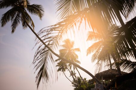 Dark silhouette of palm trees against the sky and sun flare. Tropical background with vacation at the resort