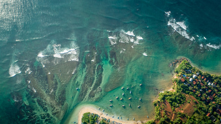Top view of beautiful beach. Aerial drone shot of turquoise sea water at the beach - space for text. Caribbean seaside beach with turquoise water and big waves aerial view. Cancun beach aerial view.