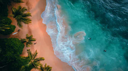 Aerial view of a serene beach showcasing turquoise waters, golden sand, and lush palm trees. The sunny day invites beachgoers to swim, surf, and relax by the shore.