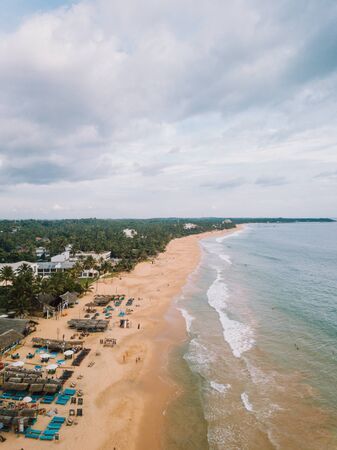 natural aerial drone bird view day shot of the sea shore with a road, beautiful villas, green trees, yellow sand, turquoise blue water, big waves and foam crashing on the beach. Pitiwella, Sri Lanka