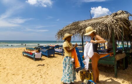 woman salesman on the beach trades with a tourist in a hat and bikini on the shore of the sandy ocean among gazebos and sunbeds. Sri Lanka Asia