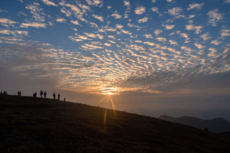 Silhouette of people watching the sun at dawn , Phu Kradueng National Park ,Thailand