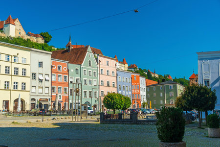Passau, Germany - July 21, 2023: Panoramic view of Passau. Aerial skyline of old town with beautiful reflection in Danube river, Bavaria, Germany.