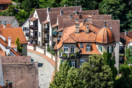 Füssen, Germany - July 20, 2019; Colorful historic houses in Füssen a touristic and historic town on the romantic road