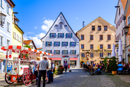 Fussen, Germany - September 1: pedestrians at the old town with historic buildings of fussen on September 1, 2021