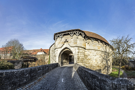 View at the city gate and of a little wooden bridge of the medieval city of Rothenburg ob der Tauber, Middle Franconia