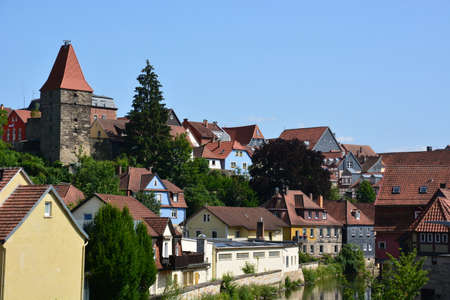 KRONACH, GERMANY - CIRCA APRIL, 2019: Townscape of Kronach with Haßlach river in front of fortress Rosenberg, Bavaria, Germany