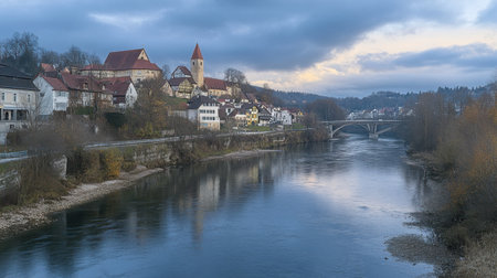 Overlooking a charming riverside town at dusk, historic buildings line the streets while hills rise in the distance under a cloudy sky. The calm river reflects the evening light.