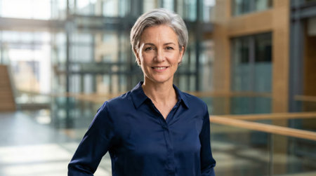 Portrait of mature businesswoman looking at camera in office. Mature businesswoman looking at camera with serious expression. Mature businesswoman standing in office.