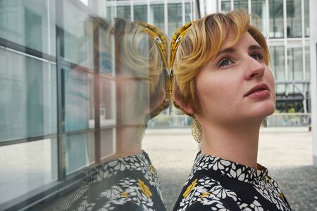A young thoughtful woman with a yellow bandana leans against a reflecting window looking to the sky