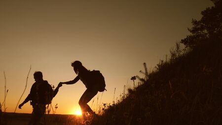 Travelers descend from mountain at sunset, hold hands. adventure and travel concept. teamwork of business people. Hiker man holds out his hand to woman traveler descending from top of hill.